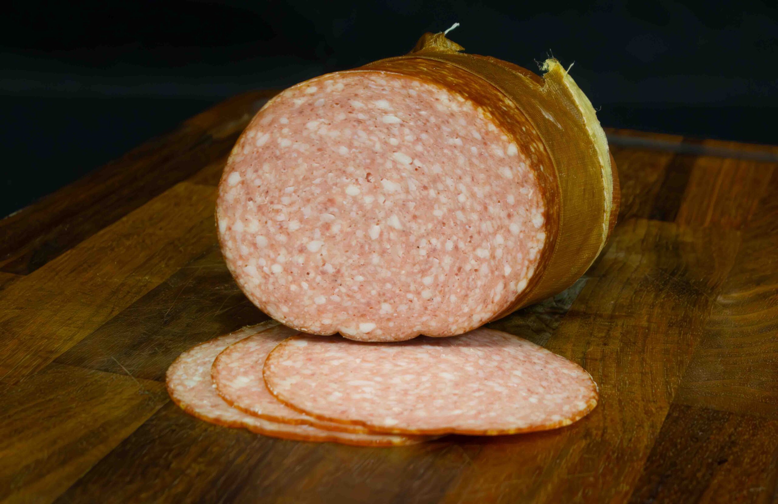 INGREDIENSER: Griskött 71%, nötkött 10%, fett från gris 15%, koksalt, MJÖLKPROTEIN, socker, vitpeppar, VITLÖKSPULVER, konserveringsmedel (E250), färgämne (E120), antioxidationsmedel (E300).